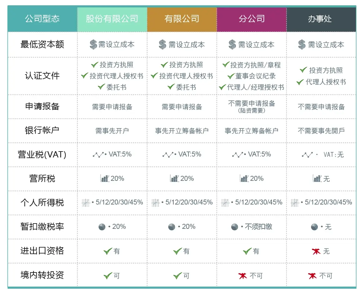 - 侨外商投资台湾,可选择注册登记的公司型态有办事处、分公司、有限公司三种,各自的型态各有不同的功能与特性,外商可依据实际需求做好相关规划,相关型态差异可见下表: